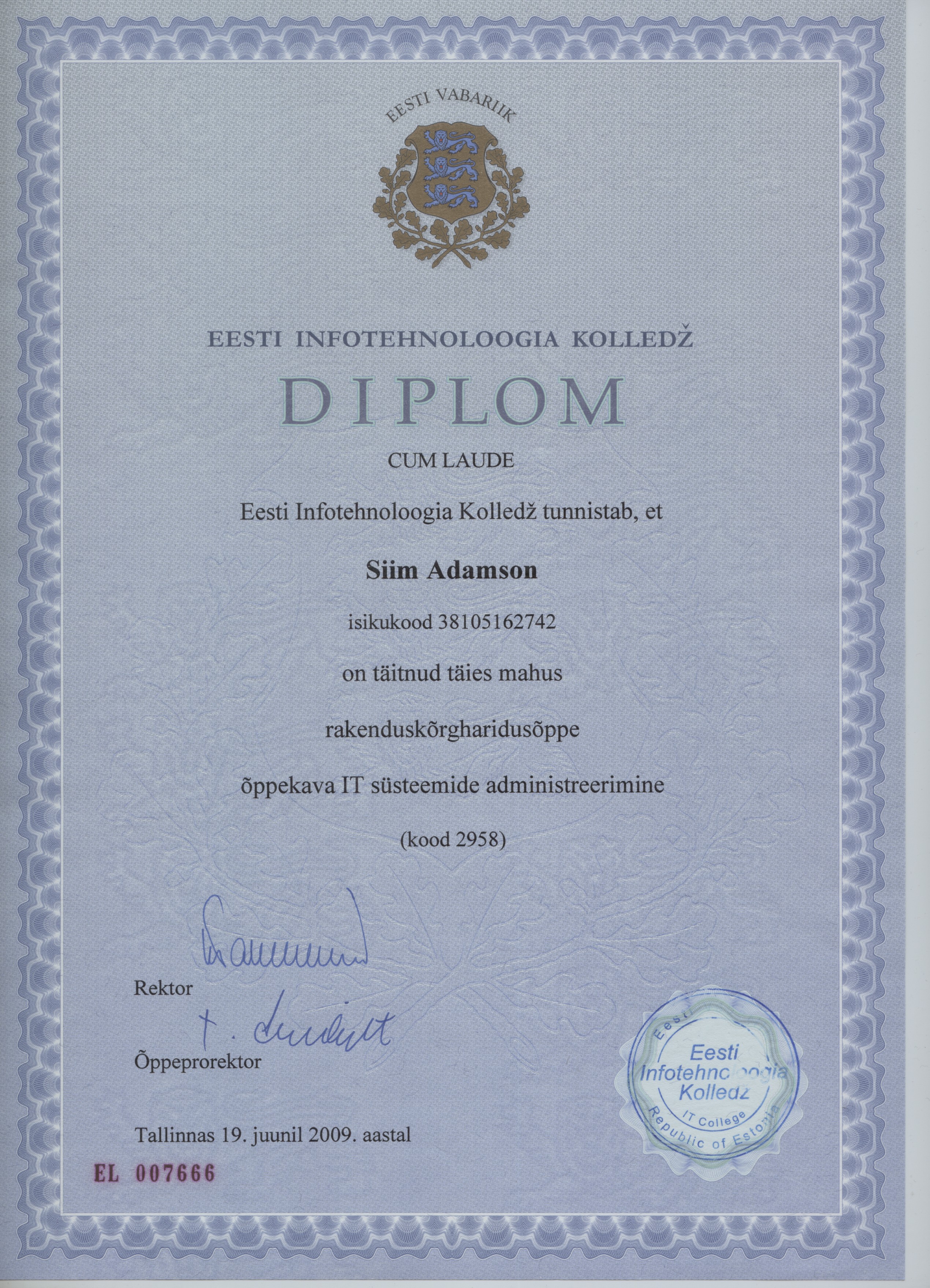 2006-2009 Estonian Information Technology College IT systems administration CUM LAUDE